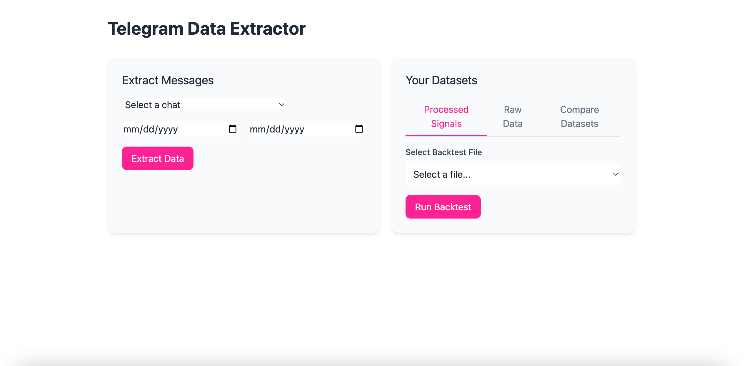 Our backtesting system connects directly to Telegram using the official Telegram API. This allows us to securely access message history for analysis.